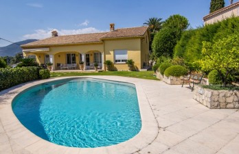 A 2 pas du centre de Vence à la Côte d'Azur, dans un quartier calme et résidentiel, villa de 1980 rénovée en 2002 sur terrain plat exposée sud avec vue mer composée comme suit : 3 chambres de plein pied, très grand séjour / salle à manger, belle terrasse ombragée, piscine, terrain de pétanque, grand garage, buanderie.